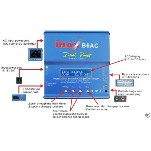 شارژر باتری iMAX B6AC قادر به شارژ و تخلیه انواع باتریهای NiMH، NiCd، Pb، LiPo، Li-ion و LiFe با قابلیت بالانس حداکثر 6 سل جداگانه لیتیومی است. این شارژر دارای یک آداپتور داخلی است که میتواند از برق 100 تا 240 ولت AC تغذیه کند یا بهطور جایگزین از طریق ورودی 11 تا 18 ولت DC نیز قابل تغذیه است. با توجه به قابلیتهای شارژ متنوع و ویژگیهای پیشرفتهای مانند مانیتورینگ توان ورودی، حساسیت دلتا-پیک، شارژ و تخلیه سیکلی و موارد دیگر یک انتخاب عالی برای محیط کار هر علاقهمند به RC، DIY یا رباتیک است.