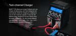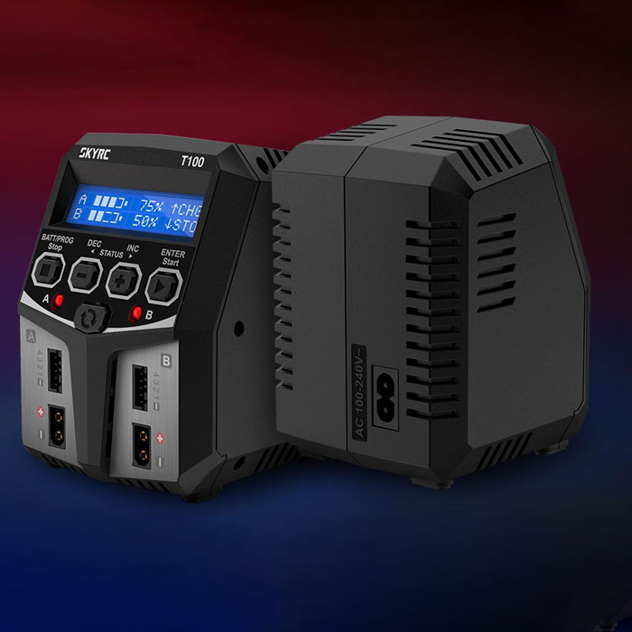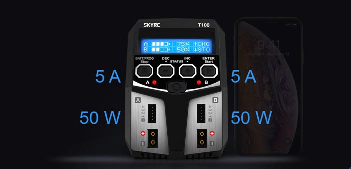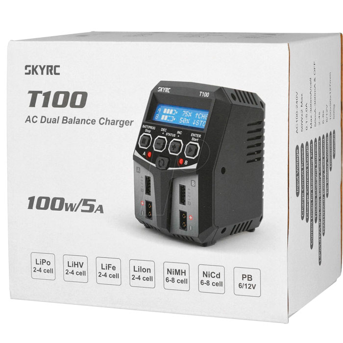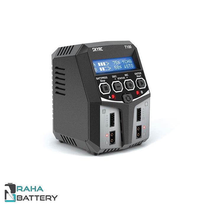 شارژر باتری SKYRC T100 DUAL یک شارژر دو کاناله با دو مدار مجزاست که قابلیت شارژ انواع باتریها از جمله LiPo, LiFe, LiIon, LiHV, NiMH, NiCd و Pb را دارد. این دستگاه با طراحی جمعوجور خود، توان شارژی تا 100 وات در هر کانال و جریان خروجی تا 5 آمپر را ارائه میدهد، که باعث افزایش سرعت و کارایی در فرآیند شارژ میشود.