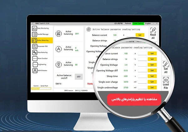 بالانسر فعال هوشمند برند DALY با قابلیت اتصال به نرمافزار کامپیوتری، امکان مدیریت و تنظیم دقیق پارامترهای حیاتی باتری را فراهم میکند. کاربر میتواند بهراحتی جریان بالانس، تعداد سلولها، ولتاژ شروع بالانس، مدت زمان خواب، محدودههای ولتاژ مجاز و بسیاری از فاکتورهای حفاظتی مانند محافظت دمایی یا افت ولتاژ را مشاهده و تغییر دهد. این ویژگی تعامل ساده و دقیق با سیستم را ممکن کرده و بهرهوری و ایمنی پک باتری را به سطح بالاتری ارتقاء میدهد. توجه: این قابلیت فقط در نسخههای اسمارت اکتیو بالانسر فعال است.