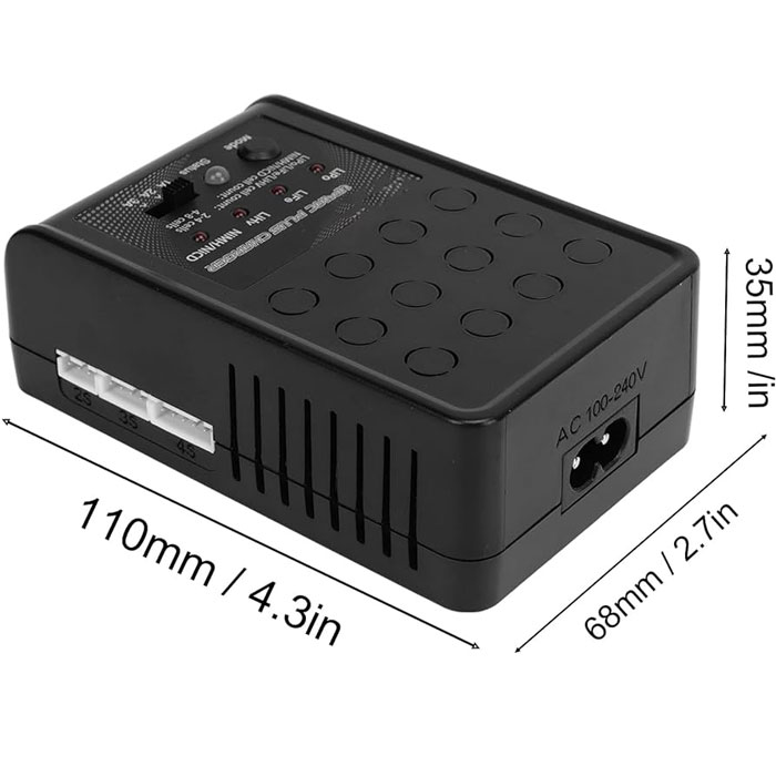 با ابعادی جمعوجور (110×68×35 میلیمتر) و وزنی سبک (170 گرم)، این شارژر بهراحتی قابل حمل بوده و گزینهای ایدهآل برای استفاده در خانه، محل کار یا حتی در سفر و محل مسابقات RC است.
